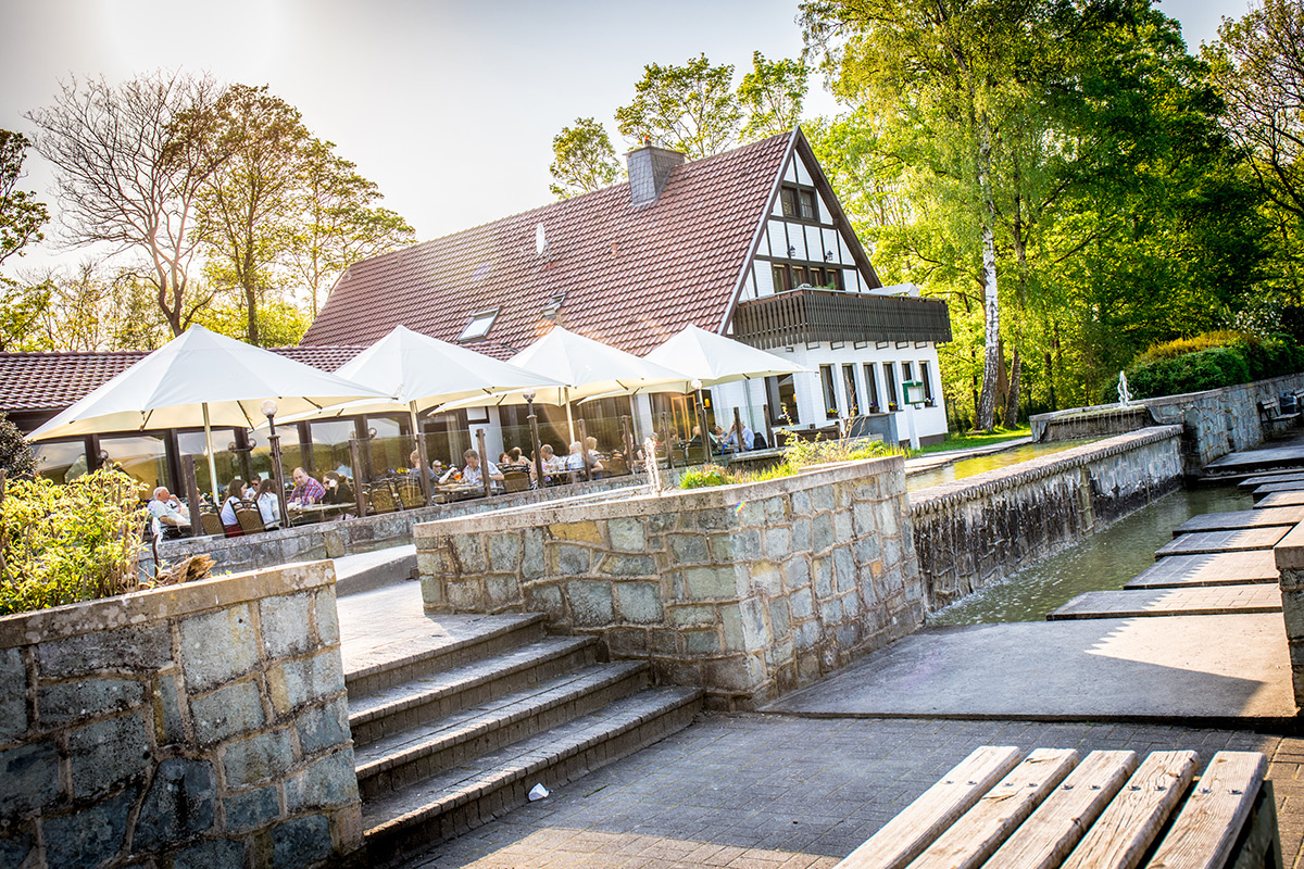 Für Ausflügler, die in der Parkanlage Erholung suchen oder auf dem nahegelegenen Werseradweg unterwegs sind, besonders interessant: Sonnenterasse, Biergarten und Innengastronomie bieten nicht nur frisch Gezapftes sowie eine internationale Speisekarte sondern in den Nachmittagsstunden auch hausgemachten Kuchen zu einer guten Tasse Kaffee.